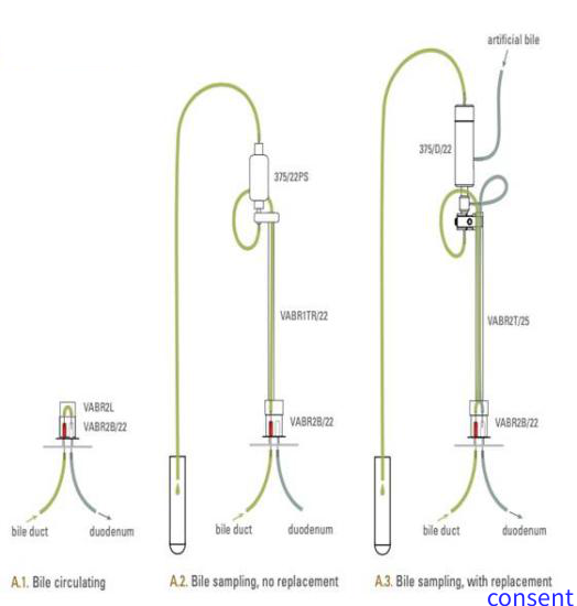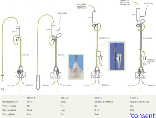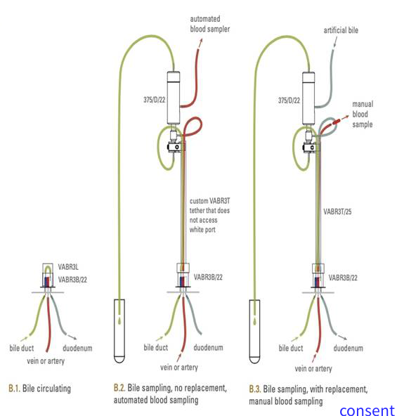 收集胆汁时,移除上盖环连接器接上拴绳, 如下面4个如中之一。 当需要有好的时间分辨率时可使用tether-mounted。胆汁流出只需要克服2英吋高的背压。需要胆汁时可迅速手动抽取,利用抽取空气来清洁管路,避免前后污染。也可接上自动采血仪ABS2进行胆汁自动采样。其它应用也可用在胆汁采样同时进行灌流或血液采样。