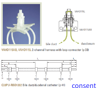 在采胆汁实验中使用C33PU- RBD1302双头导管接上胆管和十二指肠,从导管中间减断接上VAHD115AB通道马甲,盖上VAHD115L 环连接器,胆汁流动就可继续。