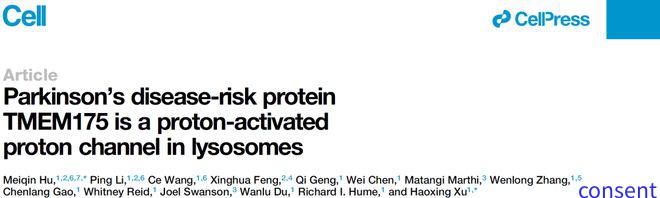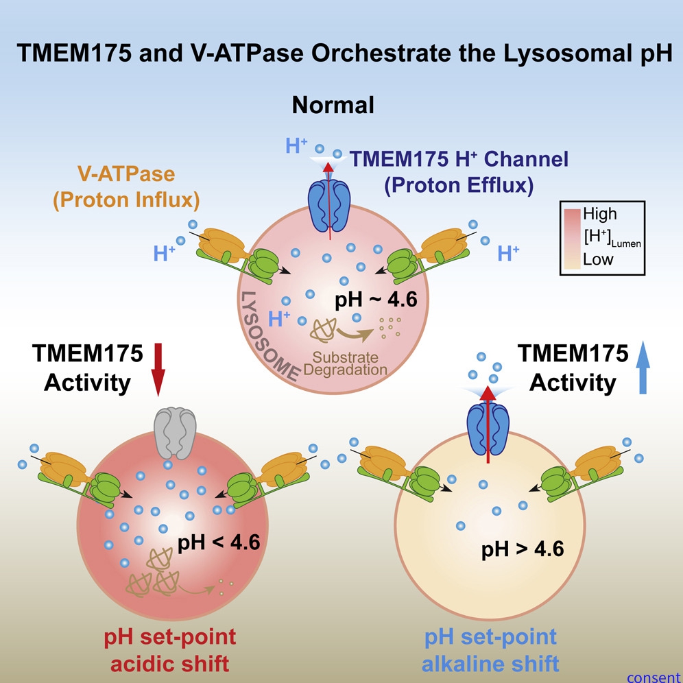 北京时间2022年6月23日晚23时,在发表于Cell杂志的一项研究中,美国密歇根大学安娜堡分校徐浩新(Haoxing Xu)团队鉴定出首个溶酶体膜上的氢离子通道TMEM175,并发现TMEM175在调控溶酶体酸碱平衡的重要作用——处于激活状态的TMEM175能够介导过量的氢离子溢出溶酶体,从而避免溶酶体内部处于过酸性状态。
