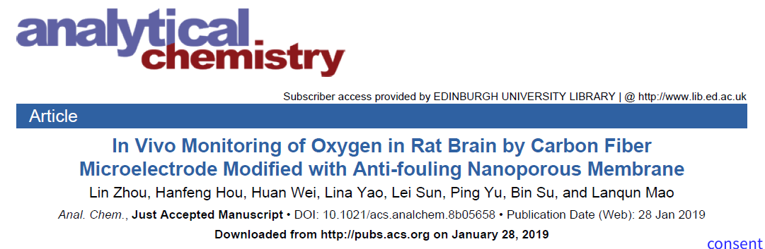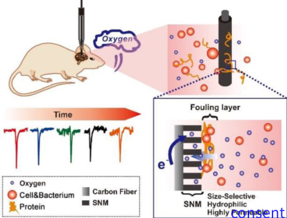 2019年1月28日,林周课题组在《分析化学》(ANALYTICALCHEMISTRY)上发表了题为“In Vivo Monitoring of Oxygen in Rat Brain by Carbon Fiber Microelectrode Modified with Anti-fouling Nanoporous Membrane”的研究论文,报告了一种用防污SNM改性的高防污CFME。他们的目的是探索防污纳米多孔膜修饰碳纤维微电极对大鼠脑内氧气的体内检测中的稳定性、抗污染能力、生物相容性等。