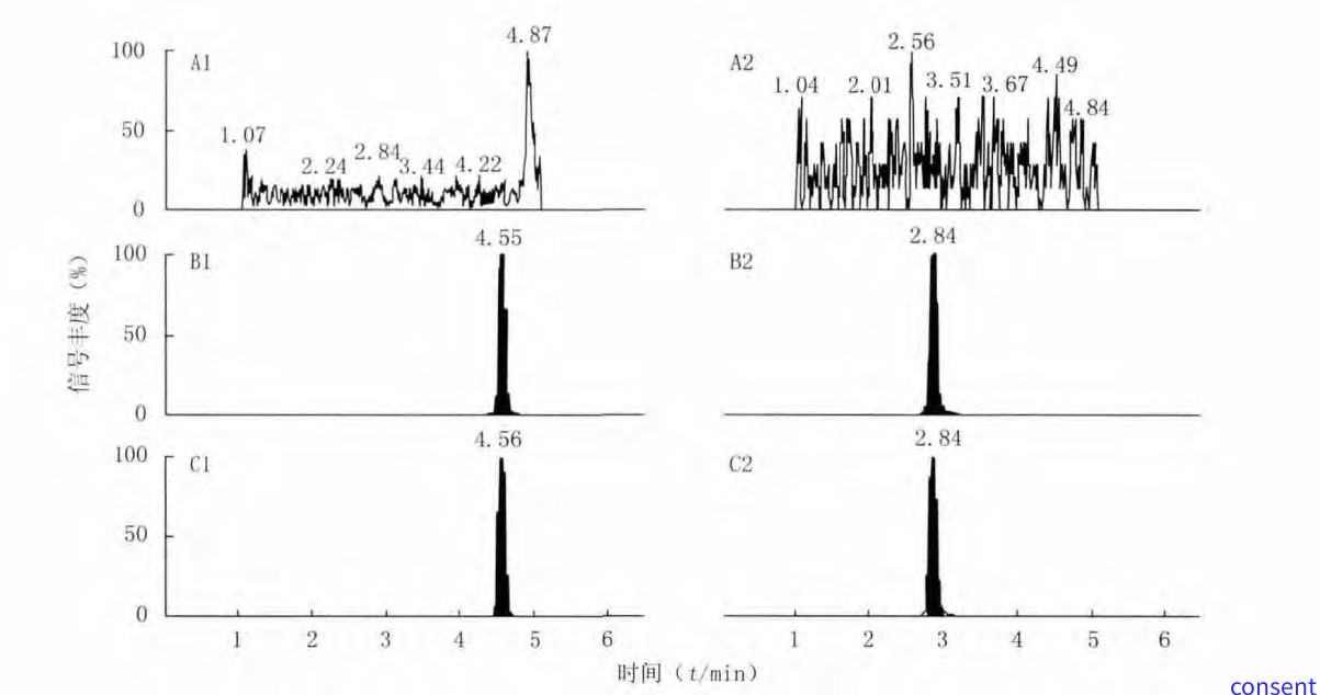 A:空白透析液;B:空白透析液+环磷酰胺对照品(0.1μg/ml)+内标安替比林(1.0μg/ml);C:微透析液样品;A1、B1、C1:环磷酰胺;A2、B2、C2:安替比林
