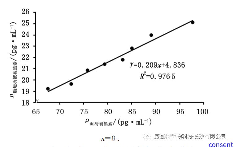 (4 ) HPLC - 荧光法测定22 : 00血清中的MLT含量为(82.62士8.09 )pg /mL ,提取回收率>90%,血清与透析液中的MLT含量具有高度正相关(r=0.987,P<0.001 )(图3);ELISA测定血清中的MLT含量为(81.31士9 .62 )pg/mL,用2种方法测定血清中的MLT含量差别无统计学意义(P=0.115)。