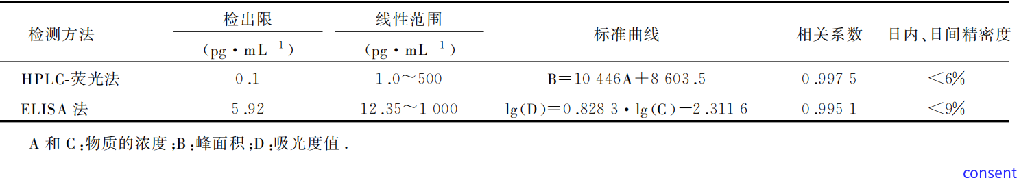 与ELISA法相比,HPLC‐荧光法具有较低的检出限值、呈较好的线性关系,日内、日间精密度<6%,重现性较好,具有灵敏、快速、准确的特点。(表1)