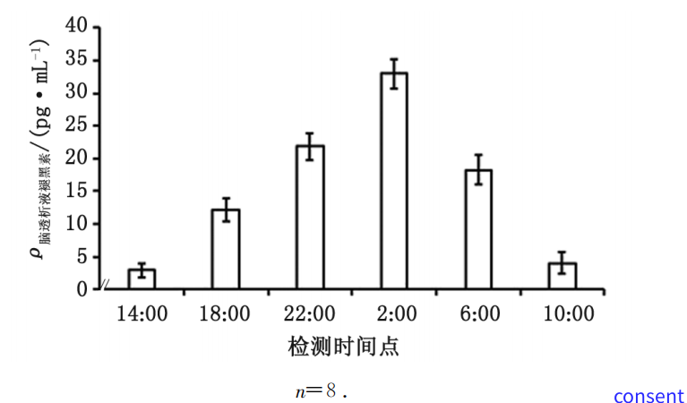 褪黑素(melatonin,MLT)主要是由松果体分泌的一种吲哚类激素,具有明显的昼夜节律性,分泌高峰在夜间,白天分泌减少,且合成与分泌受光/暗周期信号、神经系统等因素的调节。本研究以正常成年大鼠为研究对象,将引导管置入前脑纹状体内,采用脑微透析技术动态收集透析液样本,并采集大鼠尾静脉血;用高效液相色谱‐荧光法测定大鼠体内的MLT,并分析脑透析液与血清中MLT之间的相关性;同时用酶联免疫法测定血清中MLT含量,比较2种检测方法的一致性,为进一步了解体内MLT的分泌模式、MLT含量的测定提供一种更为合理、有效的方法 。