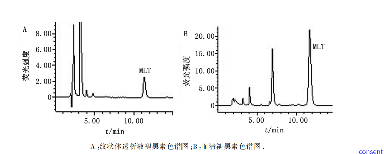 本研究结果表明,用改良的HPLC‐荧光检测法测定大鼠脑透析液以及血清中的MLT含量简单、快速、灵敏、准确、重复性好、成本低,血清中MLT和脑内MLT具有很好的相关性,且 HPLC‐荧光法和ELISA法测定血清MLT具有较好的一致性,为探究体内MLT分泌模式、测定MLT含量提供一种有效的方法 。