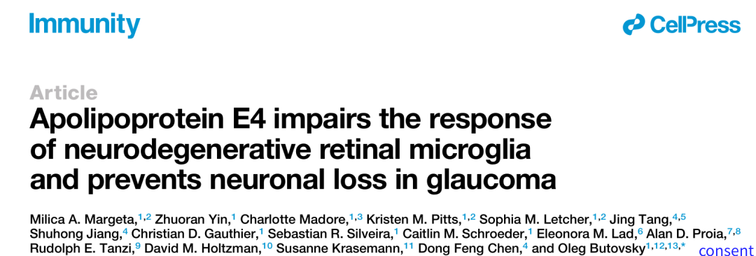 2022年8月15日哈佛医学院Oleg Butovsky研究团队揭示了APOE4等位基因可减弱小胶质细胞神经退行性疾病表型,在青光眼模型中保护神经节细胞的作用,表明了 APOE4可作为阿尔茨海默病的“砒霜”,青光眼的“蜜饯”!