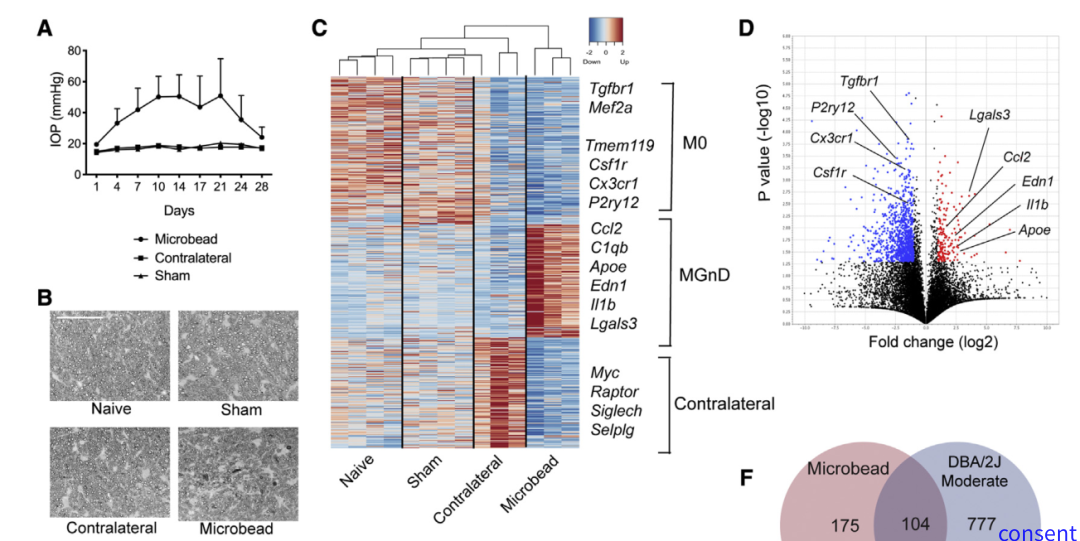 本文通过两种青光眼小鼠模型发现小胶质细胞由稳态转变为神经退行性疾病相关的状态(转录组学水平),并进一步揭示了小胶质细胞的APOE- Galectin-3信号通路在青光眼小鼠模型中发挥保护视网膜神经节细胞丢失的作用。