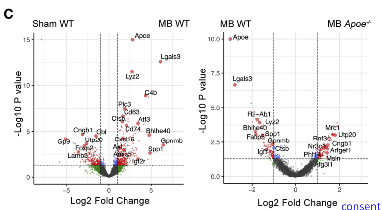单细胞测序技术发现注射磁珠引起野生型小鼠视网膜表现出疾病状态相关小胶质细胞核心基因表达明显增加,但在敲除Apoe后这些基因表达均下降,即便是表达增加最强的Lgals3也下降。