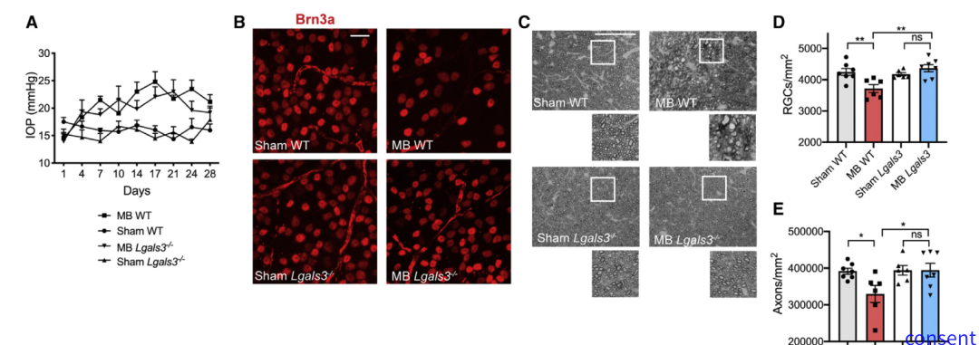进一步揭示了小胶质细胞的APOE- Galectin-3信号通路在青光眼小鼠模型中发挥保护视网膜神经节细胞丢失的作用。