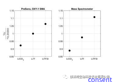 图 2:在 DMSO 中不同锂盐的1 mol/dm 3电解质溶液中溶解氧的相对浓度,与在纯溶剂中测量的值相关;使用 OXY-1 SMA(左)和质谱结果(右)进行光学 DO 测量。