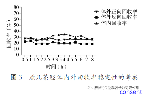 结果显示,随着灌流液流速提高,原儿茶醛脑微透析探针回收率逐渐降低,原儿茶醛质量浓度不会影响脑微透析探针回收率,且8 h 内原儿茶醛脑微透析探针回收率基本保持稳定。微透析取样时,流速越快,半透膜两侧物质交换的效率越高,单位时间内收集的样品体积越多,但回收率越低;相反,流速越慢则回收率越高,但样品体积会减少。