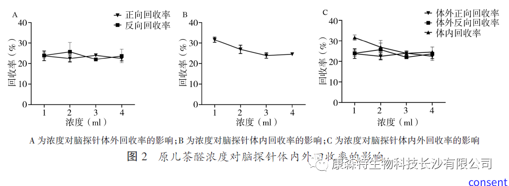 考察不同灌流速度、药物浓度对原儿茶醛脑微透析探针体内外正向和反向回收率的影响,以及体内外回收率的稳定性。