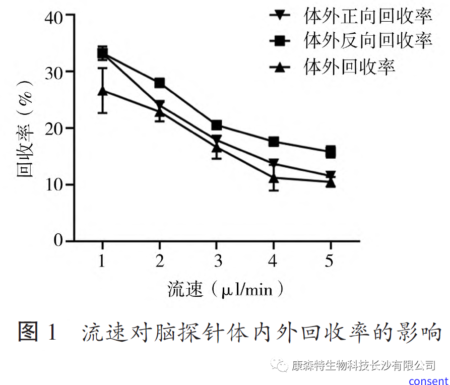 探针回收率可用正、反透析法来测定。其中正透析法可以说明探针的真实回收率,反透析法则可显示体内回收率与真实回收率的统一性。研究选择正透析和反透析2 种实验方法来探究流速、浓度和探针稳定性对大鼠脑微透析探针体内外回收率的影响。