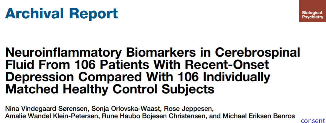 近日,根本哈根大学医学院精神健康研究中心的Michael Eriksen Benros团队在Biological psychiatry上发表题为“Neuroinflammatory Biomarkers in Cerebrospinal Fluid From 106 Patients With Recent-Onset Depression Compared With 106 Individually Matched Healthy Control Subjects”的临床研究论文,通过分析首发抑郁症患者的脑脊液,发现抑郁症患者脑脊液的白细胞计数明显增加,并且白细胞数量和抑郁症的严重程度呈正相关关系。