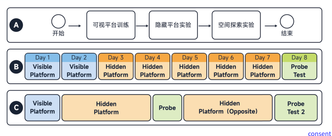 在某些情况下完成B中的实验之后,研究人员会对向放置平台位置,再次进行重复隐藏平台期和空间探索实验,检测小鼠重新产生正确记忆的能力。