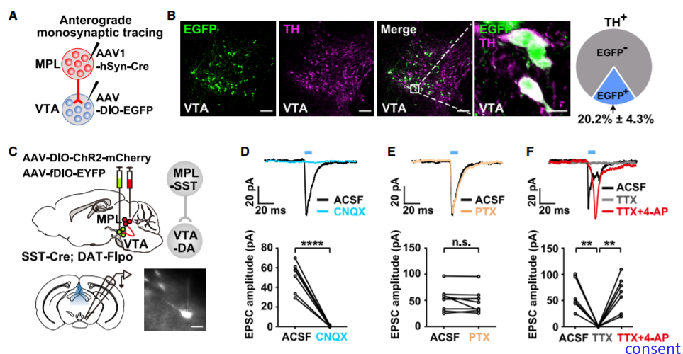 病毒示踪实验发现MPL-STT神经元投射到VTA脑区,并与多巴胺能神经元形成突触。光激活MPL-STT神经元投射到VTA脑区多巴胺能神经元后可引起自我理毛行为,同时伏隔核区域多巴胺释放明显增加(伏隔核是VTA脑区多巴胺能神经元的主要靶向脑区),阻断多巴胺受体信号后可减弱自我理毛行为。