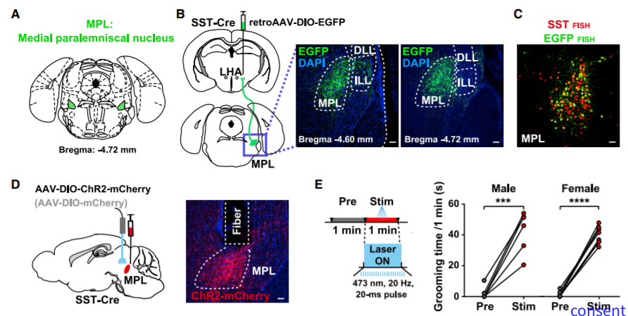 光激活或化学遗传学慢性激活中脑内侧脑桥旁核(MPL)区域生长抑素(SST)能神经元(后续简称MPL-SST能神经元)后促进雌、雄小鼠的自我梳理行为,激活非SST能神经元并不发挥这种作用。有意思的是,抗抑郁药物氟西汀能够抑制激活MPL-SST能神经元引起的自我理毛行为。