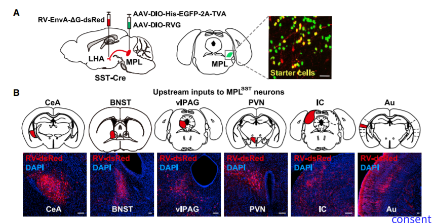 逆行示踪病毒实验发现MPL主要接受来自于中央杏仁核(CeA)、终纹床核(BNST)、腹外侧中脑导水管周围灰质(vlPAG)、下丘脑室旁核(PVN)、下丘(IC)和听觉皮层(Au)。在激活CeA-MPL环路后可促进自我理毛行为,而在激活BNST或vlPAG环路后抑制自我理毛行为,激活上述其他环路并不影响自我理毛行为。