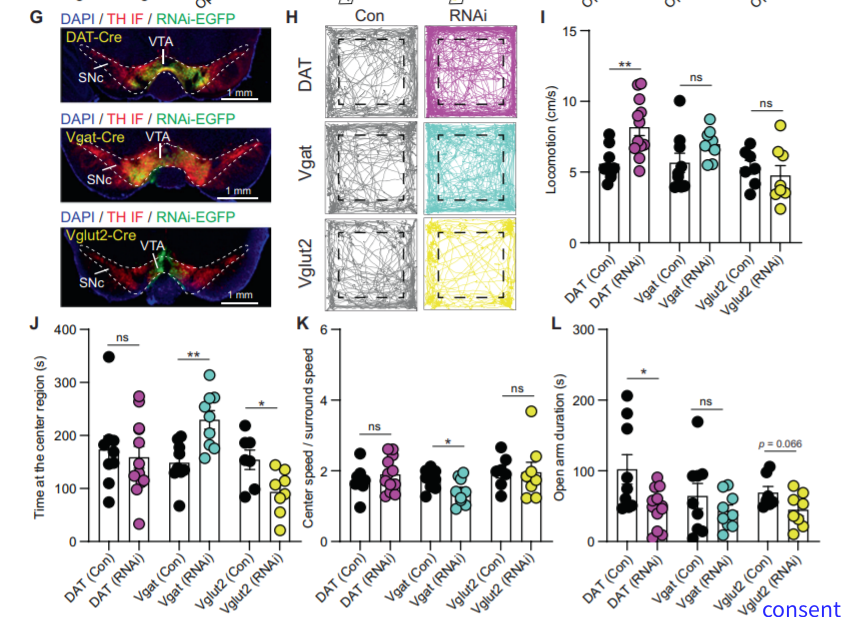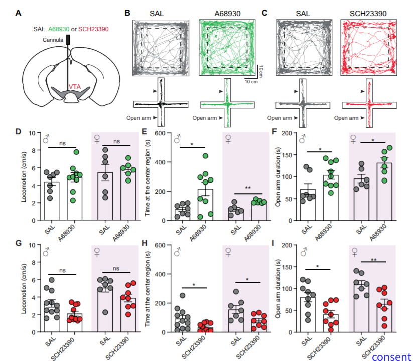 研究人员发现雌性和雄性小鼠VTA脑区注射D1受体激动剂后促进小鼠在旷场实验中心区域停留时间,增加小鼠在开放臂的时间,表明抗焦虑效应,相反该区域注射D1受体抑制剂后或通过病毒降低D1受体表达后则引起焦虑样行为障碍。2.表达D1受体的不同类型神经元调控焦虑行为