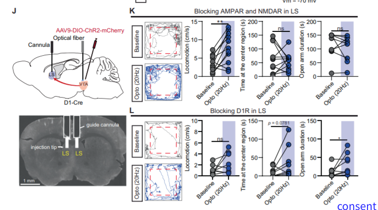 研究表明VTA神经元投射到NAc、mPFC、外侧隔核(LS)、基底外侧杏仁核、腹侧海马调节情绪行为。病毒示踪实验也发现VTA区域D1受体阳性神经元也投射到上述脑区,只有光激活VTA区域D1受体阳性神经元投射LS的轴突促进小鼠在中心区域和开放臂的停留时间,发挥抗焦虑效应。