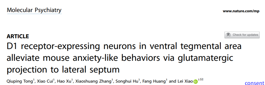 2022年10月4日复旦大学脑科学研究院肖雷研究员在Molecular Psychiatry杂志上发表文章揭示VTA区域D1受体调控焦虑行为的环路机制。