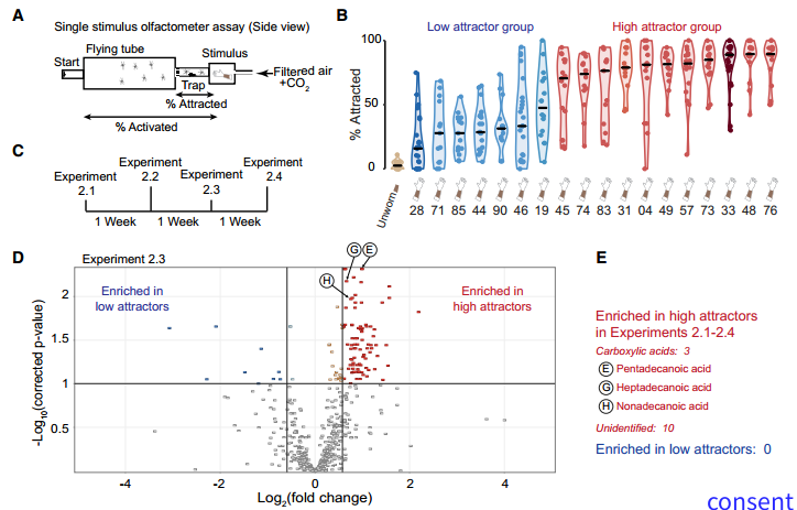 本文发现蚊子对不同人类皮肤气味存在的偏好性,高度吸引蚊子的人,其皮肤气味中十五烷酸、十七烷酸和十九烷酸表达水平显著增加,以上羧酸气体通过蚊子的IR受体传递嗅觉信息,定位人类的位置。该研究结果为阻断通过蚊子传播的黄热病、登革热、寨卡病毒等疾病提供了有效的干预策略。