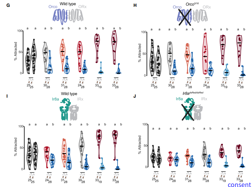 蚊子通过两类气味门控离子通道感知嗅觉信息,即气味受体(OR)和离子型受体(IR)。为了研究蚊子是否通过嗅觉感知人类气味,研究人员将OR的共受体(Orco)和IR的共受体(Ir8a、Ir76b和Ir25a)分别进行突变。