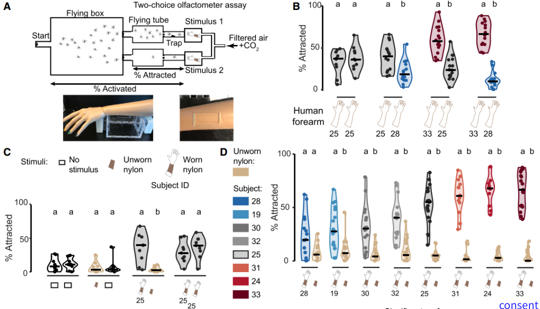 研究团队招募了64名受试者,每天在双臂穿戴6小时的尼龙丝袜以沾染受试者的皮肤气味,并设计出二选一气味偏好实验。即将设计出两条通风管道,将不同受试者的尼龙丝袜放置在上风口,挥发性的气味会顺着风向到蚊子聚集地,若蚊子喜欢该气味,则需要逆风飞行近1米,到达上风口。