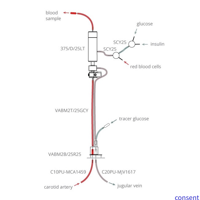 小鼠葡萄糖钳夹实验系统是美国范德堡大学MMPC中心开发和传授的。双通道马甲是由范德堡大学MMPC中心的研究者设计,简化了连接路径,并且小鼠在不实验的时候,可以群居在一起。Instech提供了在大鼠和小鼠上进行此项实验的完整系统,从动脉、静脉埋置管所需要的管路、给药系统连接的接头,并带有3个和4个方向连接器的特殊系绳,以及控制胰岛素、葡萄糖、红细胞等物质输送的灌流泵。输液和取样管路均通过连接到双通道小鼠马甲、低扭矩双通道旋转接头运行。输液管连接到颈静脉导管,取样管连接到颈动脉导管。虽然放置两根导管的手术很困难,但在笼外收集血液,而不是从尾巴或其他急性方法收集血液,可以最大限度地减少影响数据的动物压力。双通道小鼠马甲可以快速、无菌地连接和断开静脉输液管,并且还允许在小鼠不在研究时将其分组饲养。系绳使用环形电线连接到旋转接头,以便线条可见,并在按钮连接器上内置一个Y连接器,以便可以在动物附近进行示踪剂注射。泵具有专为葡萄糖钳夹研究设计的用户界面软件。想了解更多内容,获取相关咨询请联系