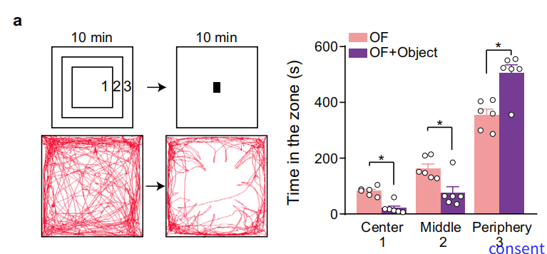 小鼠在旷场实验大部分时间在周边区域自由活动,小部分时间在中心区域活动,但在中心区域放置陌生的物体(电池)后,小鼠进入周边区域的时间明显增多,进入中心区域的时间变得更少。有意思的是,即便是将电池换成玩具飞机或金属回形针,也能明显引起小鼠的趋避行为。这就表明陌生的物体引起小鼠的焦虑水平。