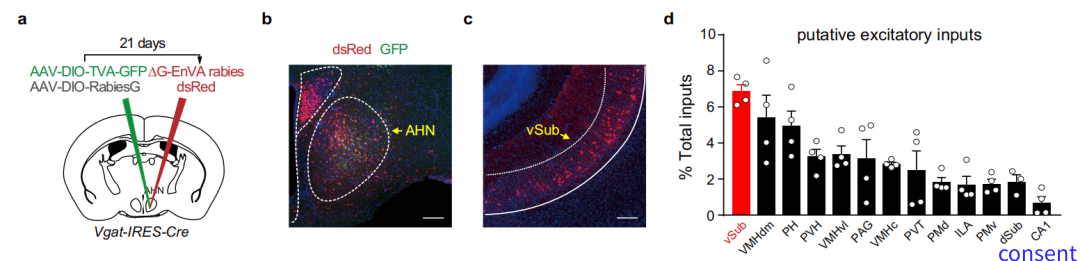 逆行示踪实验发现AHN区域抑制性神经元接受来自于外侧隔核、内侧视前区(MPO)和终纹床核(BNST)等多个脑区的输入,其中接受腹侧海马下托(vSub)的输入最多。光纤钙成像技术发现小鼠在靠近或离开陌生物体vSub-AHN环路神经元活性增强,而抑制该神经环路后促进小鼠进入中心区域,减弱对陌生物体的趋避行为。