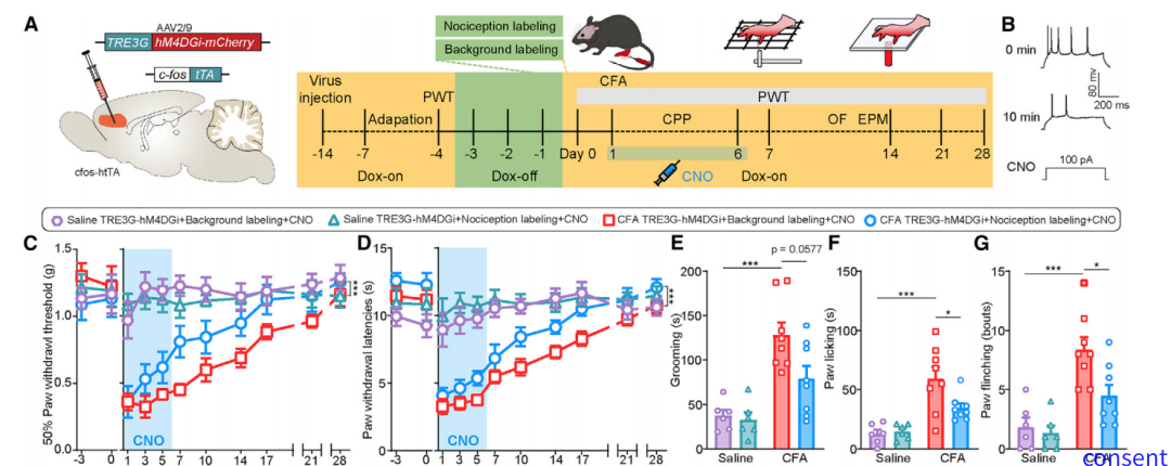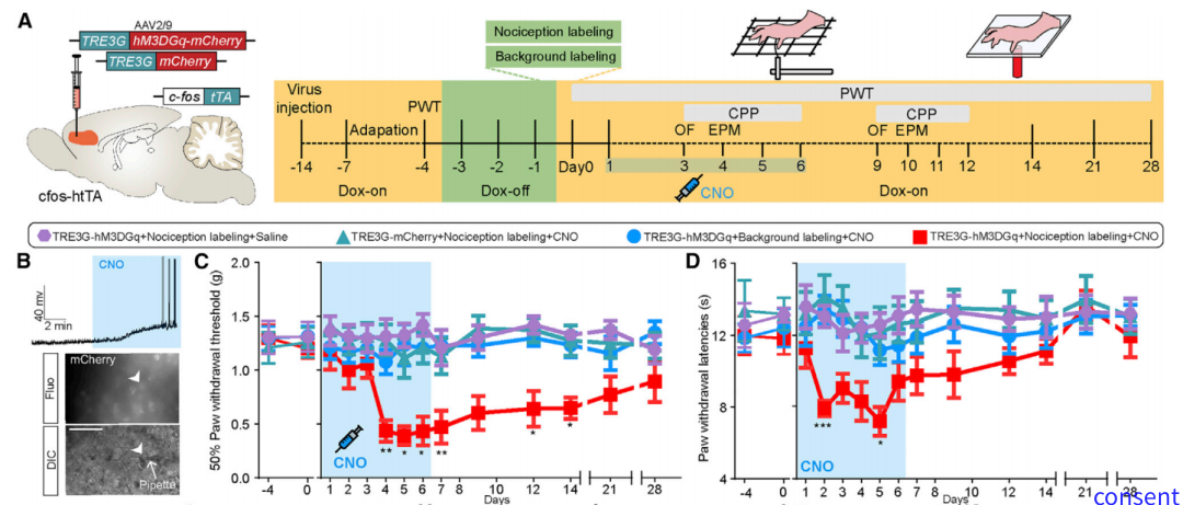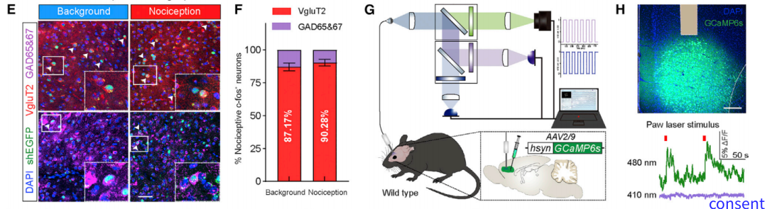 研究人员通过cfos-htTA 小鼠发现急性伤害性刺激能够激活dmPFC一群谷氨酸能神经元群。通过双光子显微镜动态观察发现在第一天足底注射弗氏左剂注射激活的dmPFC神经元群一直存在后续连续足底刺激过程中,这就表明伤害性刺激激活的dmPFC神经元群可能参与慢性疼痛过程。