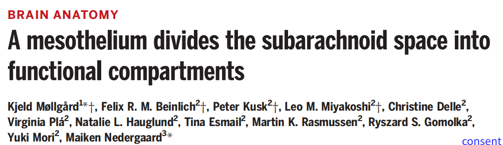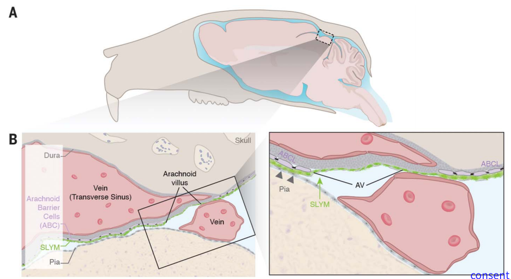 中枢神经系统由硬脑膜、蛛网膜和软脑膜分隔排列,具有支持和营养大脑的作用。硬脑膜由两层合成,血管和神经走行于两层之间,软脑膜形成的邹襞突入脑室内,形成脉络丛,分泌脑脊液。心血管搏动驱动脑脊液沿周围间隙流入脑深部,并通过胶质细胞水通道蛋白4进行间液交换。脑脊液由脑膜中的淋巴管网络排出,这种排出功能出现障碍后加速蛋白质的聚集,引起认知功能障碍。蛛网膜与软脑膜之间有较大的间隙,称为蛛网膜下腔。2023年1月6日罗切斯特大学医学中心Maiken Nedergaard研究团队重新定义了大脑脑膜系统,发现了存在于蛛网膜下腔中存在一类淋巴样膜,将该腔室分为两个部分,成为大脑的第四层膜结构。Prospero相关同源异形盒蛋白1(PROX1)是一种高度保守的、决定淋巴命运的转录调节因子,可用于标记淋巴管内皮细胞标志物。研究人员通过双光子显微镜观察Prox1-EGFP工具小鼠躯体感觉皮质区域发现在与硬脑膜平行的胶原束下方,存在一层连续的、扁平的Prox1-EGFP+单层细胞,与松散的胶原纤维混合在一起,称为蛛网膜下腔淋巴样膜(SLYM)。进一步分析发现SLYM厚度为14.2 um,覆盖蛛网膜下腔血管,而硬脑膜平均厚度为21.8 um,被胶原纤维包绕,两者存在明显的结构差异。全脑结构分析发现SLYM与静脉窦内皮细胞直接接触,为静脉窦壁上的蛛网膜下腔绒毛样结构。人类皮层组织中也发现SLYM存在于整个蛛网膜下腔。进一步分析发现SLYM厚度为14.2 um,覆盖蛛网膜下腔血管,而硬脑膜平均厚度为21.8 um,被胶原纤维包绕,两者存在明显的结构差异。全脑结构分析发现SLYM与静脉窦内皮细胞直接接触,为静脉窦壁上的蛛网膜下腔绒毛样结构。人类皮层组织中也发现SLYM存在于整个蛛网膜下腔。Prox1-EGFP小鼠红色荧光团结合的1微米微球注入蛛网膜下腔硬膜下浅表隔室,同时在蛛网膜下腔深部隔室内注射1微米蓝光荧光微球,结果发现这些荧光团并没有互相渗透。此外,渗透性实验发现不允许3kDa及以上的分子通过。这就表明SLYM是一种屏障,将蛛网膜下腔空间细分为上浅表层和下深层两个腔室。