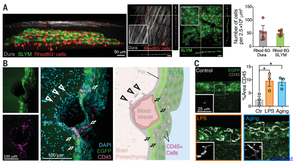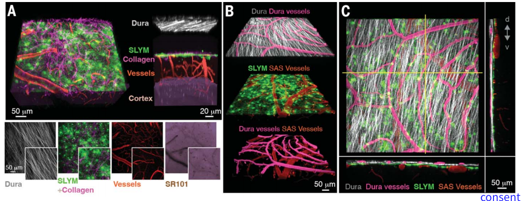Prox1-EGFP+ SLYM细胞也表达另一种淋巴标记物PDPN及细胞维A酸结合蛋白2 (CRABP2) ,表明其作为依赖淋巴样结构。进一步的荧光实验表明SLYM并不表达蛛网膜屏障细胞层的紧密连接主要成分CLDN-11也不表达蛛网膜小梁的标志物淋巴管内皮受体1。这些结果表明SLYM并不是蛛网膜的一部分,而是围绕着大脑的第四脑膜层。研究人员通过双光子显微镜发现SLYM中存在大量的白细胞,而在腹腔注射脂多糖后可明显增加SLYM中的白细胞聚集,这种异常的聚集也发现在衰老小鼠中。此外,SLYM中也存在巨噬细胞和树突状细胞,这就表明SLYM可作为免疫细胞发挥作用的关键微环境。本文发现在小鼠和人类大脑中均存在分隔蛛网膜下腔空间的第四层脑膜-SLYM,它包裹着血管,与静脉窦内皮紧密相连,允许脑脊液和静脉血进行物质交换。同时,SLYM驻留多种免疫细胞,为大脑免疫功能屏障和液体运输功能研究提供全新的视野。