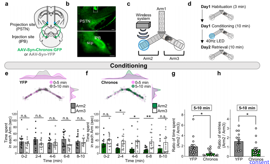 他们进一步通过LED照射实现无线激活lPB-PSTN环路,在实时条件性位置偏好实验中小鼠在经过适应后在LED灯光照射区域和无LED灯光照射区域停留的时间几乎一致。而光激活lPB-PSTN环路后引起小鼠位置回避行为,不愿呆在LED灯光照射的一侧,促进厌恶性记忆的形成。