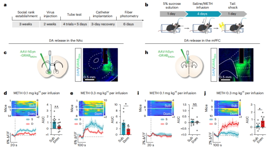 低等级小鼠NAc脑区注射信号调节激酶抑制剂降低多巴胺转运体磷酸化水平,可显著降低甲基苯丙胺觅药行为。增加高等级小鼠NAc脑区多巴胺转运体磷酸化水平并不影响甲基苯丙胺觅药行为,但光激活VTA→NAc环路可促进高等级小鼠觅药行为。光激活低等级小鼠VTA→mPFC环路后可增加其胜利概率,提高社会等级,在甲基苯丙胺自身给药实验中觅药行为减少。