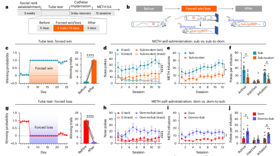 研究人员通过钻管实验筛选出高社会等级地位和低社会等级大鼠,在甲基苯丙胺自身给药实验中低社会等级大鼠觅药行为逐渐增多,冒险行为增多,高社会等级大鼠觅药行为较少,这两组小鼠的糖水消耗并不存在差异。在腹腔注射甲基苯丙胺后低社会等级大鼠表现出过度活动,而高社会等级大鼠自发活动相对较低。在甲基苯丙胺诱导的条件性位置偏好实验中低社会等级大鼠表现强烈的位置偏好,而高社会等级大鼠这一效应较弱,表明低社会等级大鼠更容易出现甲基苯丙胺成瘾行为。