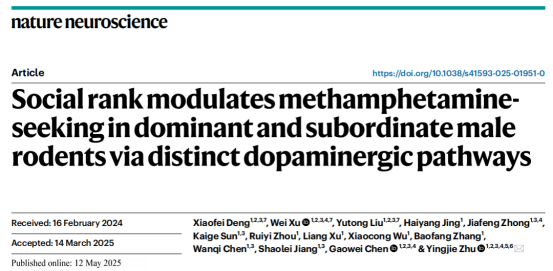 2025年5月12日中国科学院深圳先进技术研究院朱英杰课题组在Nature neuroscience上发表文章揭示了社会等级通过中脑-边缘多巴胺通路和中脑-皮质多巴胺通路差异性调控药物成瘾行为。