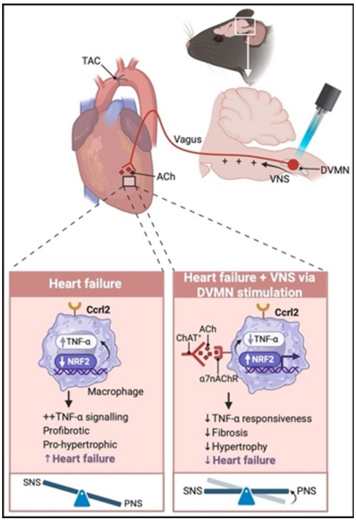 免疫系统,尤其是心脏巨噬细胞,在心力衰竭及其疾病进展中起关键作用。尽管交感神经对心脏及脾脏炎症的调控已有报道,副交感神经在调节心脏炎症和心力衰竭结局中的作用仍未被充分阐明。