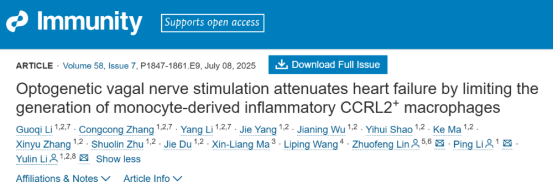 2025 年 7 月 8 日,首都医科大学附属北京安贞医院李玉琳团队联合广东医科大学心血管代谢病创新中心,在国际免疫学顶级期刊《Immunity》发表题为“Optogenetic vagal nerve stimulation attenuates heart failure by limiting the generation of monocyte-derived inflammatory CCRL2⁺ macrophages”的研究论文。