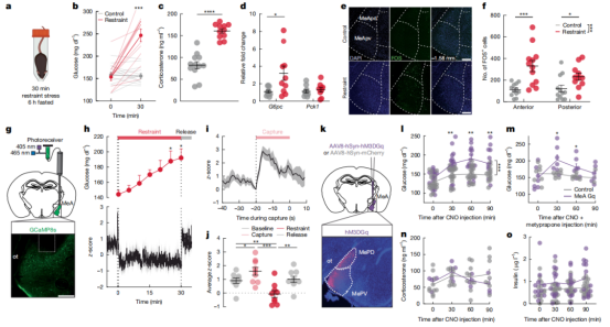 小鼠接受急性束缚应激(30分钟)血糖水平快速升高,血浆皮质酮水平也升高,血浆胰岛素和去甲肾上腺素水平并未升高。免疫荧光实验发现急性束缚应激后MeA脑区激活的神经元数量显著增多。光纤钙成像系统记录到急性应激引起MeA脑区钙离子活性显著升高,这种升高发生在血糖水平升高之前。化学遗传学慢性激活MeA脑区神经元可引起血糖水平升高,并可持续1小时,并能短暂抑制摄食行为,皮质酮合成抑制剂并不会阻断血糖水平的升高。此外,激活MeA脑区神经元并不影响血浆胰岛素、皮质酮水平,也不影响焦虑和恐惧相关行为。光激活MeA脑区神经元也可引起血糖水平升高,抑制摄食行为。