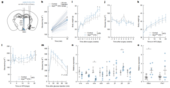 小鼠单次暴露在领地化应激鼠笼中,血糖水平升高,MeA神经元钙离子活性增加;暴露5次领地化应激鼠笼中血糖水平并不会升高,MeA神经元钙离子活性也不增加。在每天接受2次应激,连续5天的慢性应激也能减弱MeA神经元活性,表明慢性应激抑制应激诱发的血糖升高。肝脏的交感神经支配通过α2A肾上腺素能受体抑制胰高血糖素诱导的cAMP和葡萄糖输出,β2肾上腺素能受体促进葡萄糖输出。特异性诱导投射到VMH的MeA神经元后摄食行为增多,体重增加,并降低α2A肾上腺素能受体表达,增加β2肾上腺素能受体,G6pc的表达升高,并可阻断急性应激引起的血糖升高。