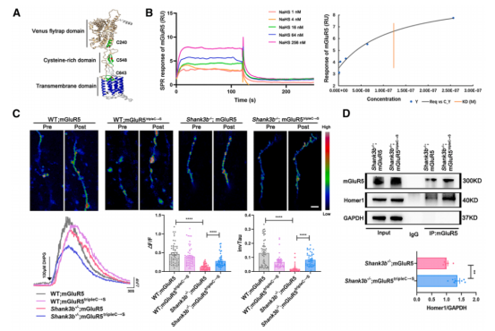分子实验发现Shank3b敲除小鼠ACC脑区mGluR5 and MAPK1蛋白巯基化水平升高。考虑到mGluR5 在自闭症发病中的重要性,研究人员发现mGluR5第240、548和643位的半胱氨酸残基被巯基化。光学表面等离子共振技术发现硫化氢与mGluR5存在互作。通过病毒工具引起mGluR5上述三个位点突变后可阻断Shank3b敲除小鼠mGluR5 巯基化,促进mGluR5与Homer-1的互作,可有效诱导长时程增强作用,有效改善社交障碍。