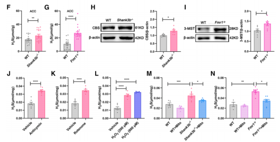 透射电镜发现Shank3b敲除和Fmr1敲除小鼠ACC脑区神经元胞体中线粒体数量显著减少、长径变小。此外,这两种敲除小鼠线粒体呼吸链复合体Ⅱ活性降低,复合体IV活性增加,活性氧水平显著增加。代谢组学分析发现Shank3b敲除和Fmr1敲除小鼠ACC脑区共同表达上调的代谢产物中约25%为氨基酸代谢物相关。在这些氨基酸代谢产物中存在胱硫醚和蛋氨酸的,均与硫氨基酸代谢途径密切相关。进一步实验发现这两种敲除小鼠ACC脑区胱硫醚β-合酶(CBS,一种促进硫化氢合成的关键酶)蛋白表达升高,硫化氢水平显著升高,这也出现在杏仁核和内侧前额叶皮层。