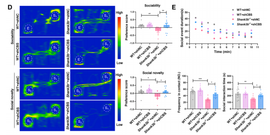 正常小鼠ACC脑区注射过表达CBS后硫化氢水平显著升高,神经元树突分支减少,成熟树突棘密度降低,Homer-1,PSD95以及AMPA 谷氨酸受体1蛋白水平降低。电生理实验发现过表达CBS引起ACC脑区兴奋性/抑制性紊乱,长时程增强作用诱导出现障碍。在三箱社交实验中过表达CBS引起社交能力和社交新颖性障碍。Shank3b敲除小鼠ACC脑区沉默CBS后硫化氢水平显著降低,神经元树突分支增多,成熟树突棘密度增加,Homer-1,PSD95以及AMPA 谷氨酸受体1蛋白水平升高,可有效诱导长时程增强作用,并能改善社交障碍。