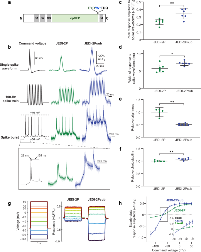 图1:在激光扫描双光子激发下,JEDI-2Psub对亚阈值电压动力学的荧光响应比JEDI-2P更大