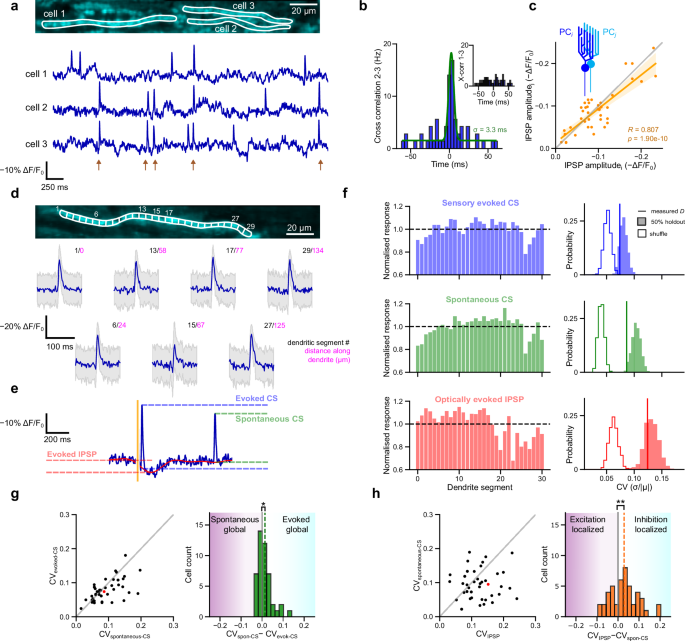 团队还将单个 PC 树突分割为~5μm 段分析,发现感觉诱发和自发复杂尖峰在树突树中分布均匀,符合攀爬纤维输入广泛分布的特点;而 IPSP 分布更异质,可能因抑制性突触输入激活离散不均导致。且复杂尖峰与 IPSP 均和基线荧光无关,证明变化具有生理性。