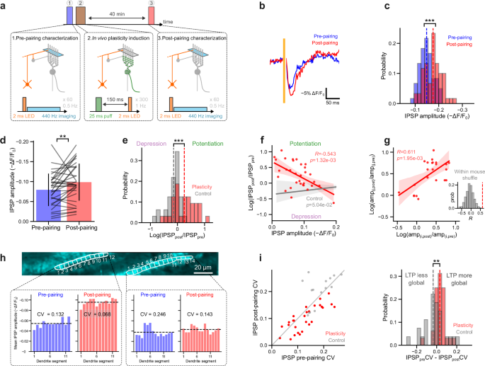 研究团队用全光学方法测量突触可塑性:将光遗传学激活的颗粒细胞(GrC)与感觉诱发的攀爬纤维(CF)输入配对(CF 激活后 150 毫秒激活 GrC,1Hz 重复 300 次),发现浦肯野细胞(PC)树突的抑制性突触后电位(IPSP)出现长期增强(LTP),可持续 40 分钟;对照组(省略配对或颠倒刺激顺序)无此增强,且自发复杂尖峰稳定,排除光漂白影响。