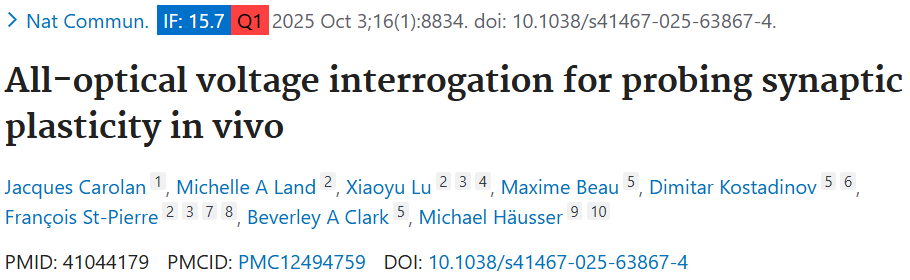 参考文献:Carolan J, Land MA, Lu X, Beau M, Kostadinov D, St-Pierre F, Clark BA, Häusser M. All-optical voltage interrogation for probing synaptic plasticity in vivo. Nat Commun. 2025 Oct 3;16(1):8834. doi: 10.1038/s41467-025-63867-4IF: 15.7 Q1 . PMID: 41044179; PMCID: PMC12494759.