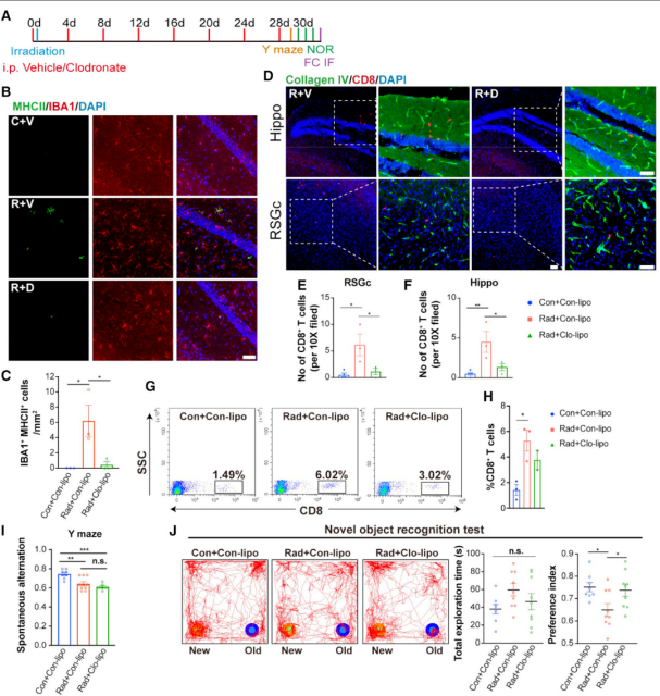 结合单核细胞相关基因特征及拟时序分析,团队推测这些cDC2样细胞可能来源于外周单核细胞。随后,利用Cx3cr1-creER::Ai9转基因小鼠对脑内髓系细胞进行谱系区分,实验结果证实:放射性脑损伤后,外周单核细胞迁入脑组织,并主要分化为树突状细胞样亚群(monocyte-derived dendritic cells, moDCs)。当采用氯膦酸盐脂质体耗竭外周单核细胞后,脑内CD8⁺ T 细胞数量显著下降,同时认知行为缺陷明显减轻,表明单核细胞衍生细胞,尤其是moDCs,是放射后CD8⁺ T细胞反应的重要调控来源(图2)。